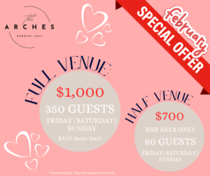 The Arches Banquet Hall opened its doors in 2008. Our 9000 square foot banquet hall provides a spacious, yet intimate feel and can accommodate up to 350 guests. The Arches has hosted countless events from weddings to corporate events and even concerts. What makes us unique? We allow our clients the freedom to customize their events by choosing their own catering and decorating vendors and choice of entertainment.